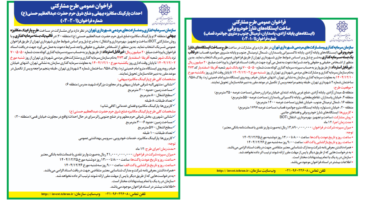 دومین فراخوان نیز در راستای ساماندهی ترافیک شهری و بهینهسازی فضای توقف خودرو، به احداث پارکینگهای مکانیزه اختصاص دارد. این بسته سرمایهگذاری شامل اجرای همزمان دو پروژه «پارکینگ مکانیزه بیهقی در منطقه ۶» و «پارکینگ مکانیزه ضلع شرق حرم مطهر حرم حضرت عبدالعظيم حسنی (ع) در منطقه ۲۰» است که در قالب روش مشارکتی BOT (ساخت، تجهیز، بهرهبرداری و انتقال) اجرا خواهد شد.